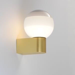 Hand-blown glass lamp in glossy white with different layers of paint. The wall versions have a metal support that holds up the diffuser, available in brushed brass and graphite.